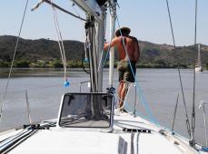 ¡¡Largamos amarras, todo el trapo arriba y rumbo a Portugal!! Nos adentramos con la marea por la desembocadura del Guadiana. Navegamos río arriba y el paisaje empieza a cambiar su ambiente marinero por una sierra salpicada de pueblos blancos, reservas naturales y antiguas fortalezas. Llegamos a Alcoutim por la tarde, una pequeña aldea portuguesa de casas encaladas situada sobre una loma que cae en el mismo río. Si os apetece también podréis alquilar unos kayaks. Fondeo libre.