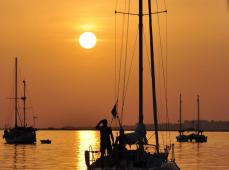 Hoy zarparemos a media mañana para poner rumbo de vuelta al Estuario del Guadiana. Durante esta intensa jornada de navegación a todo trapo podremos observar, con suerte, aves marinas y delfines surcando las olas frente a Praia Verde. Llegaremos con la puesta de sol, tonos rojos y violetas en poniente, azules intensos en levante… ¡Todo un espectáculo para nuestros sentidos! Dependiendo de las condiciones del tiempo y las mareas pasaremos la noche fondeados en el río o atracados en el puerto deportivo de Vila Real de Santo António o Ayamonte, dos poblaciones muy animadas y con mucho encanto.